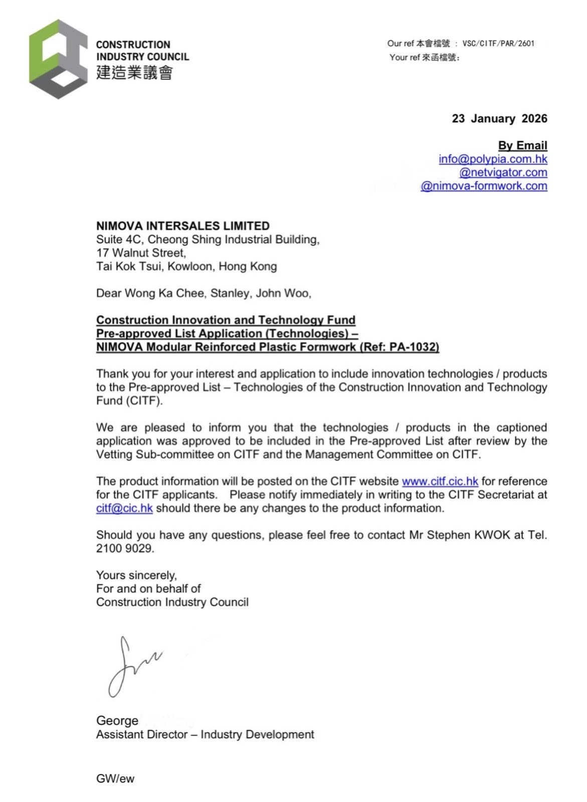 Innovation and Technology Fund's (CITF) Pre-apprived List. Nimova formwork is approved to be considered